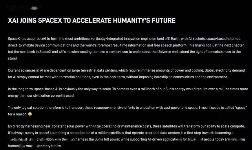 此次收购并非偶然,而是马斯克酝酿已久的战略布局,交易以换股合并的方式完成,xAI股份全部置换为SpaceX股份,收购价格较xAI近期2300亿美元的融资估值溢价约9%,最终确定xAI估值为2500亿美元,而SpaceX自身估值已达1万亿美元,两者的合体形成了无可匹敌的技术与资本壁垒。在SpaceX官网发布的签名声明中,马斯克直白地袒露了核心意图:打造地球上乃至地球之外最具雄心的垂直整合科技公司,将SpaceX的火箭、星链卫星互联网,与xAI的Grok大语言模型、X社交媒体平台深度绑定,构建一个覆盖太空探索、智能计算、全球通信的全产业链生态。